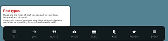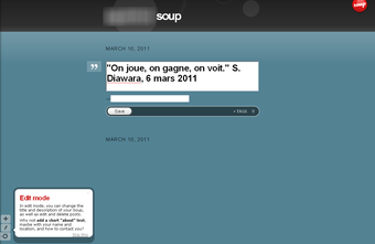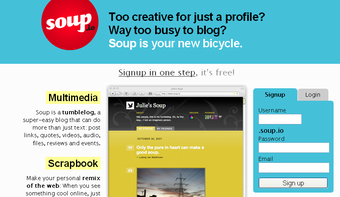 A mi-chemin entre le blog et Twitter, Soup est l'outil idéal pour ceux qui ont des choses à dire, mais pas assez de temps pour entretenir un blog. Comme Tumblr ou Posterous, ce "tumblelog" (blog fourre-tout, en français) permet de créer rapidement des mini-articles de blog.