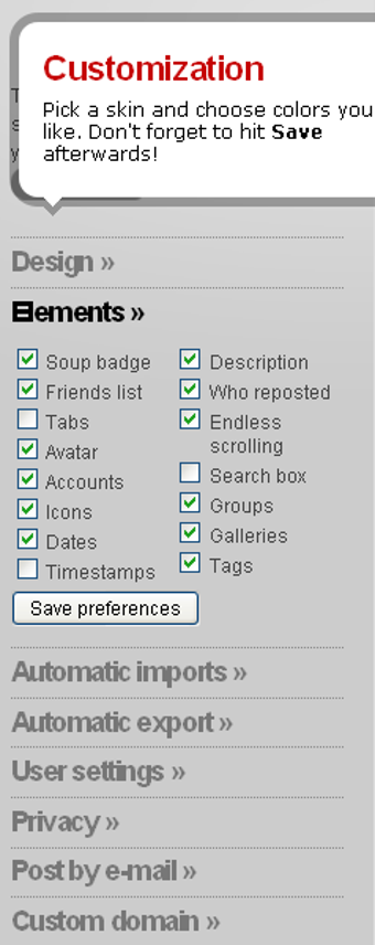 Le défaut de Soup.io face à la concurrence est le manque d'options de personnalisation: 4 habillages sont disponibles, ainsi que de rares éléments "customisables".
